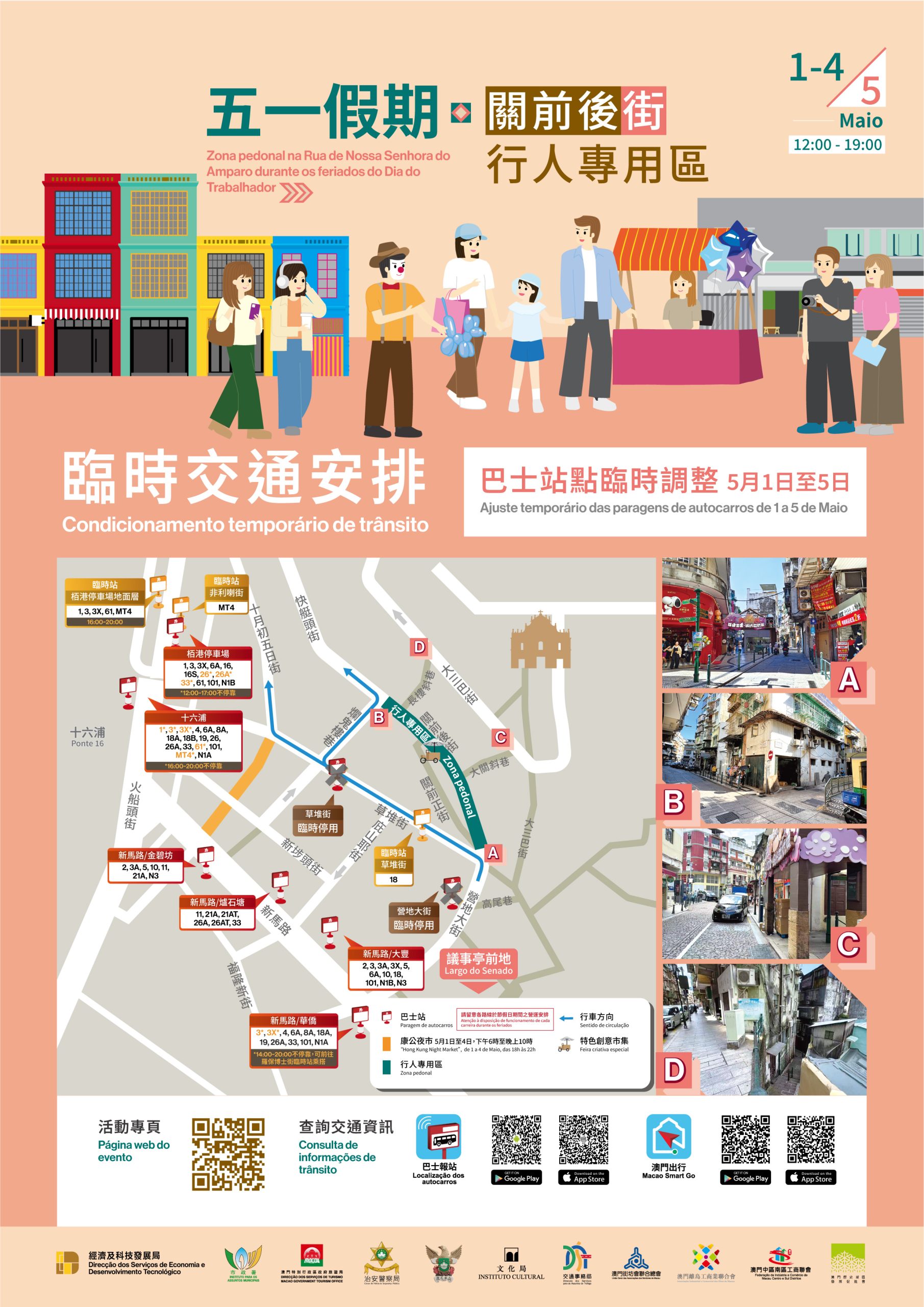 巴士服務方面,五月一日至四日每日早上十一時至尾班車,氹仔舊城區四個巴士站將臨時停用,多條巴士路線需改道行駛,乘客可改用臨時站或周邊站點上落;另外,毗鄰關前後街區域的巴士路線則維持正常運作。因應節日期間新馬路的臨時巴士措施,五月一日至五日期間,途經草堆街的巴士路線全日實施臨時靠站安排。交通事務局已指示兩巴於客流高峰站點加強指示及增派人員協助分流乘客,並密切監測各站點候車情況,適時採取調度措施,確保公交交通有序運作。