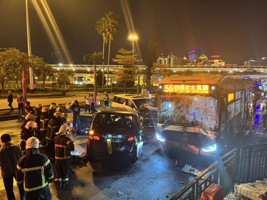 昨晚七時許,治安警接報友誼大馬路近海港前地,發生巴士與兩部私家車相撞意外,有傷者及有人被困,隨即派員到場處理,兩部七人車的男司機、巴士男司機及女乘客受傷,其中一車的司機腳部被夾困在車廂內,消防一方面用工具展開救援,另一方面處理其他傷者。