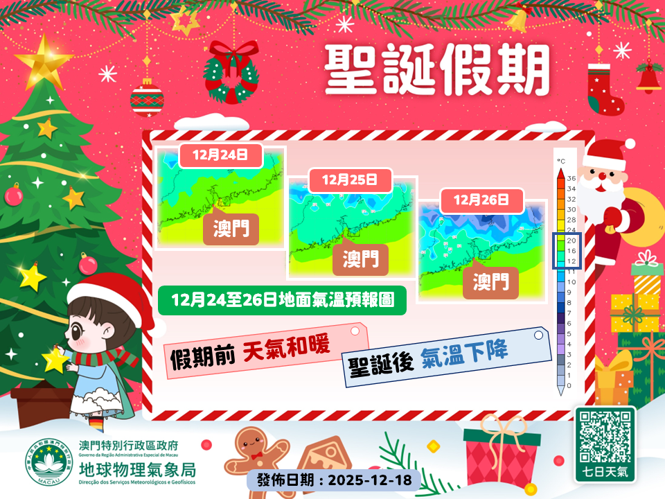氣象局的七日天氣預報顯示,平安夜氣溫介乎攝氏十八度至二十五度,聖誕節最低氣溫降至攝氏十五度,週五“拆禮物日”進一步降至攝氏十三度。