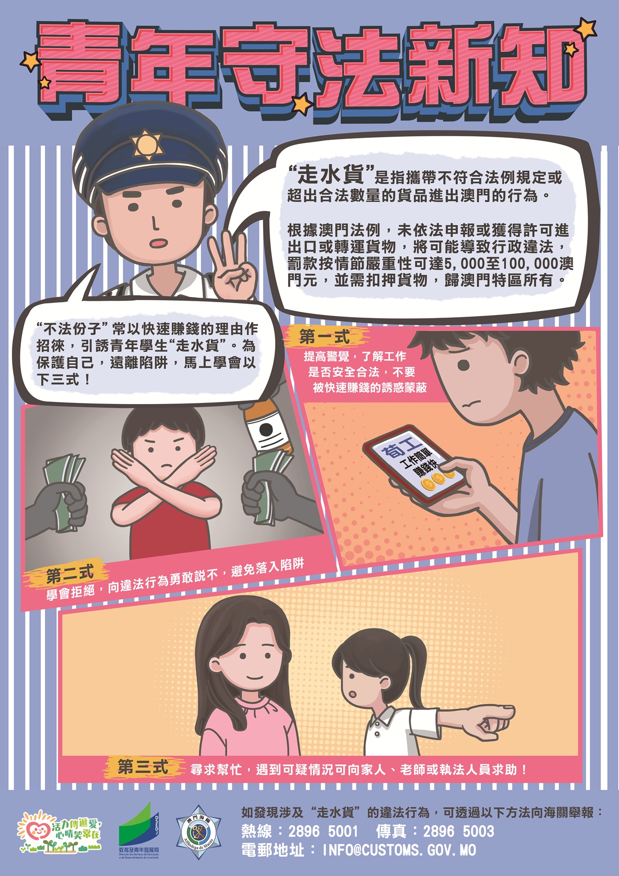 為加強宣教普法工作,教青局聯同澳門海關、警務部門及教育團體等,設立“跨部門促進青少年成長保護網”,構建防止青少年涉及違法行為的預警機制。