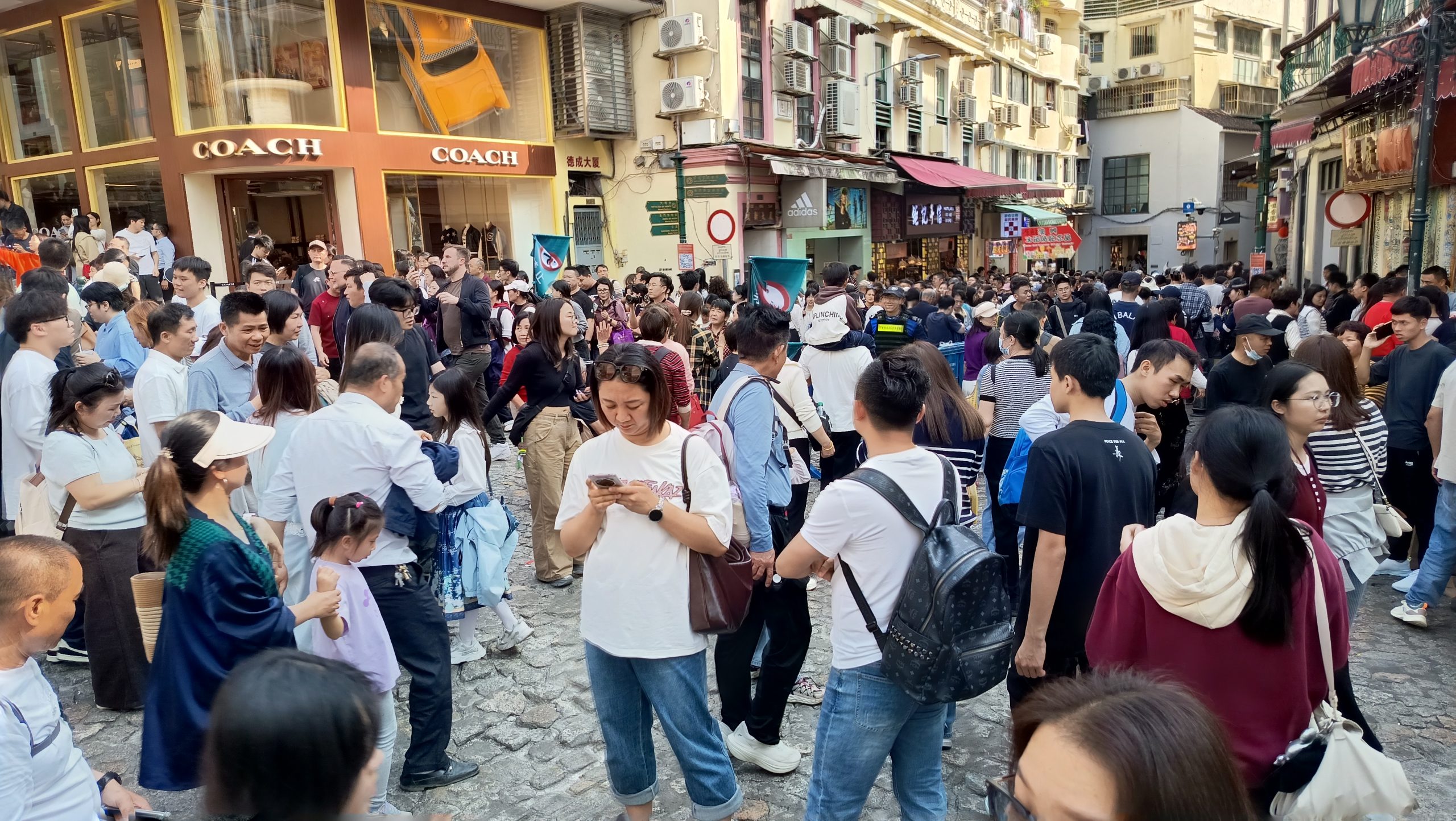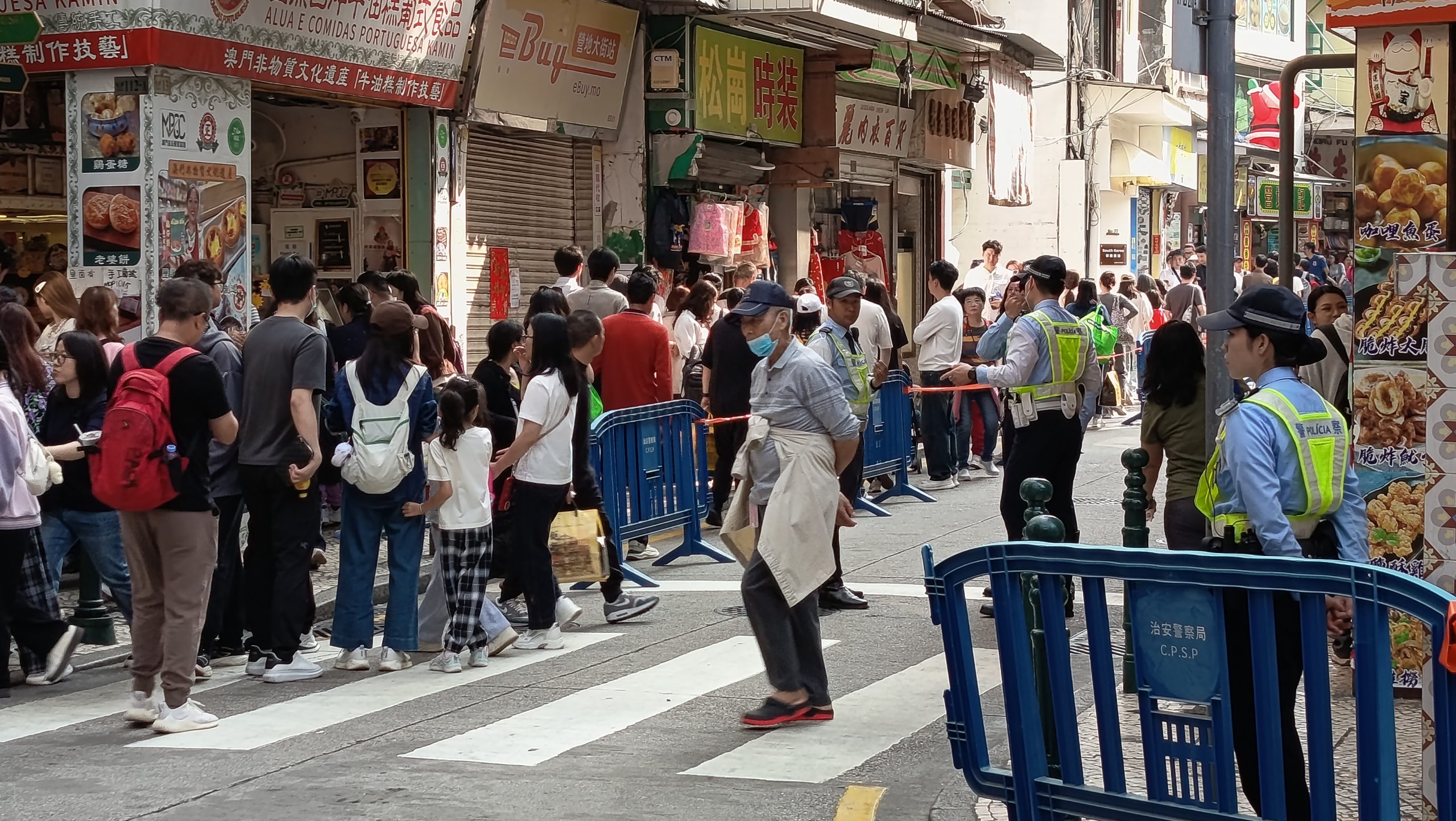 治安警表示,由於大三巴街人流擠擁,分別於昨日上午十二時五十五分及下午四時四十分實施人潮管制,大三巴街行人只可單向上行前往牌坊,並取道周邊的街巷如大關斜巷、關前後街、高園街等離開。