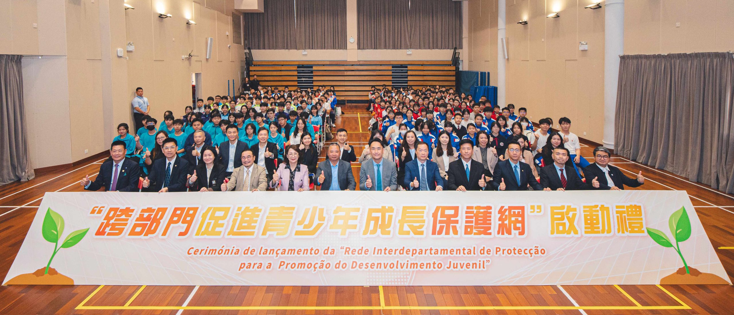 “跨部門促進青少年成長保護網”啟動禮於3月23日在高美士中葡中學舉行。教青局局長龔志明、副局長阮佩賢及黃嘉祺,澳門海關副關長李煜輝,法務局副局長邱顯哲,社會工作局副局長許華寶,警察總局局長辦公室顧問劉中志,衛生局仁伯爵綜合醫院代院長彭蓬光,治安警察局策劃行動廳廳長源劍鋒,司法警察局社區警務及公共關係處處長趙朱惠敏,消防局教育宣傳及公關處代處長黃思添,澳門中華教育會理事長鄭杰釗,澳門天主教學校聯會理事長劉麗妹,澳門高等教育發展促進會監事長仲偉合,以及治安警少年團、司警局滅罪小先鋒、海關守正之星、消防局救護小先鋒、法務局普法動力、教青局品德與公民推廣大使和學生代表共220人出席。