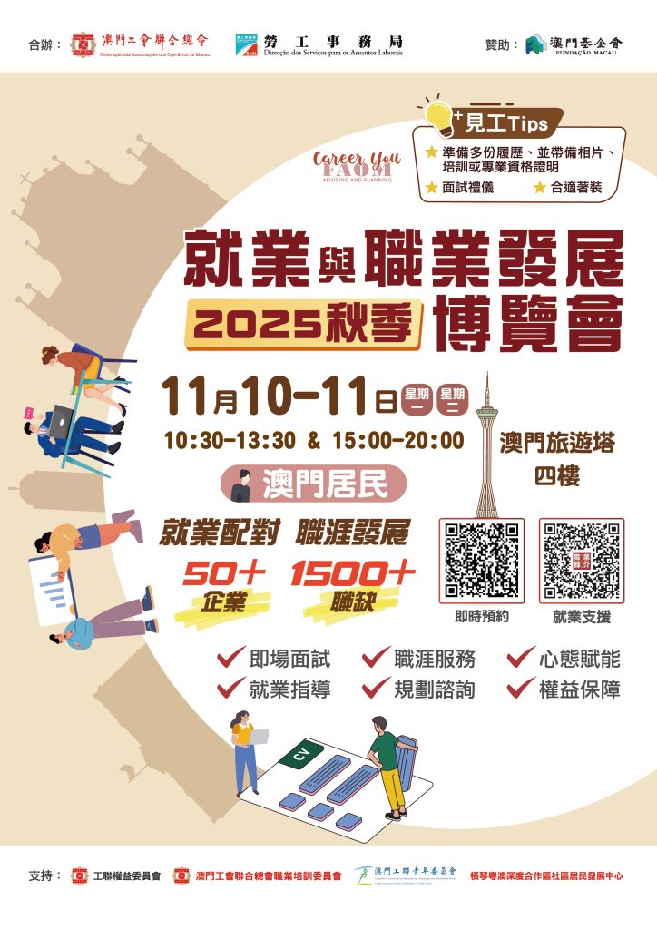 【本報訊】由勞工事務局和工聯合辦的“二零二五秋季就業與職業發展博覽會”(下稱博覽會)將於十一月十日至十一日一連兩日在澳門旅遊塔會展娛樂中心四樓舉行。今次博覽會匯聚逾五十間企業參與,提供逾一千五百個職位空缺,覆蓋綜合休閒旅遊、酒店、銀行金融、資訊科技、公共事業及零售等多個行業,為澳門居民提供就業對接平台。