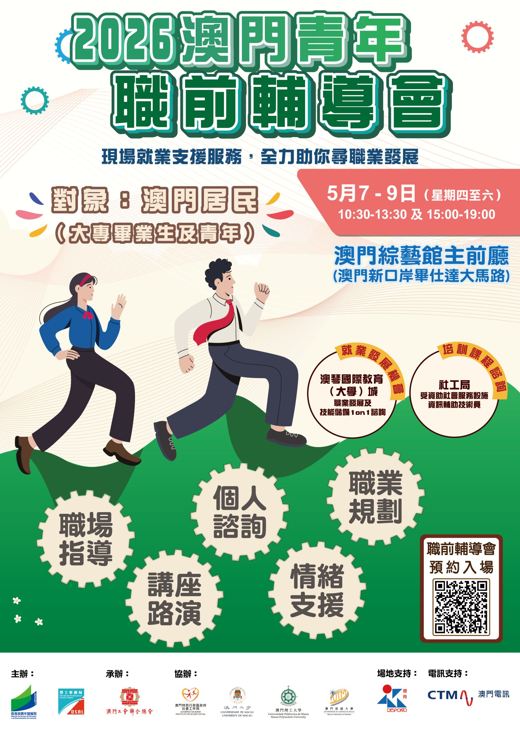 有意參加兩項活動的澳門青年,可於今日至五月五日中午十二時期間登入勞工事務局專頁進行網上預約進場及報名,名額有限,欲報從速。成功報名者將收到確認短訊,屆時憑短訊簽到進場參與相關活動。