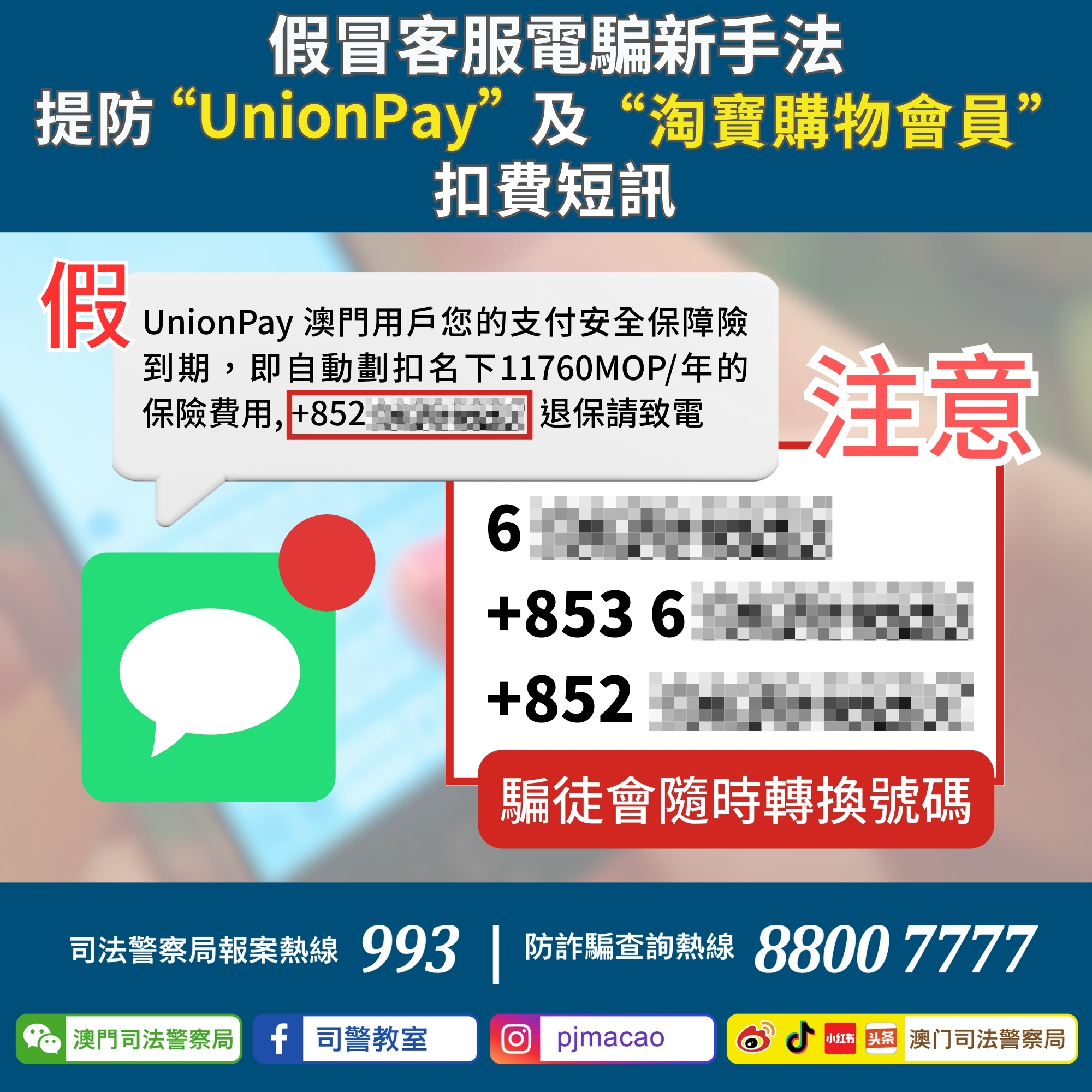 司警局呼籲提防假冒“UnionPay”及“淘寶購物會員”扣費短訊