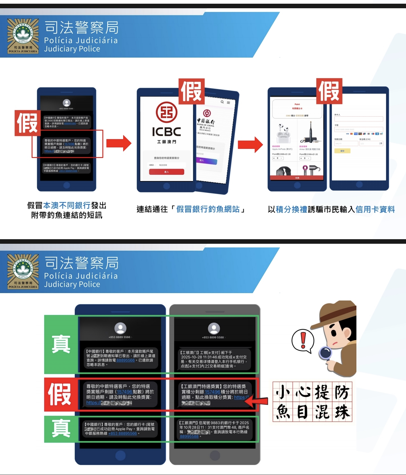 司警昨日舉行特別警情發佈會,講述有關假冒銀行釣魚短訊詐騙情況。騙徒一般會發短訊指事主為“特選客戶”,指其的銀行積分到期,還會假冒銀行的電話號碼混入真實的短訊內,混淆事主的視線。