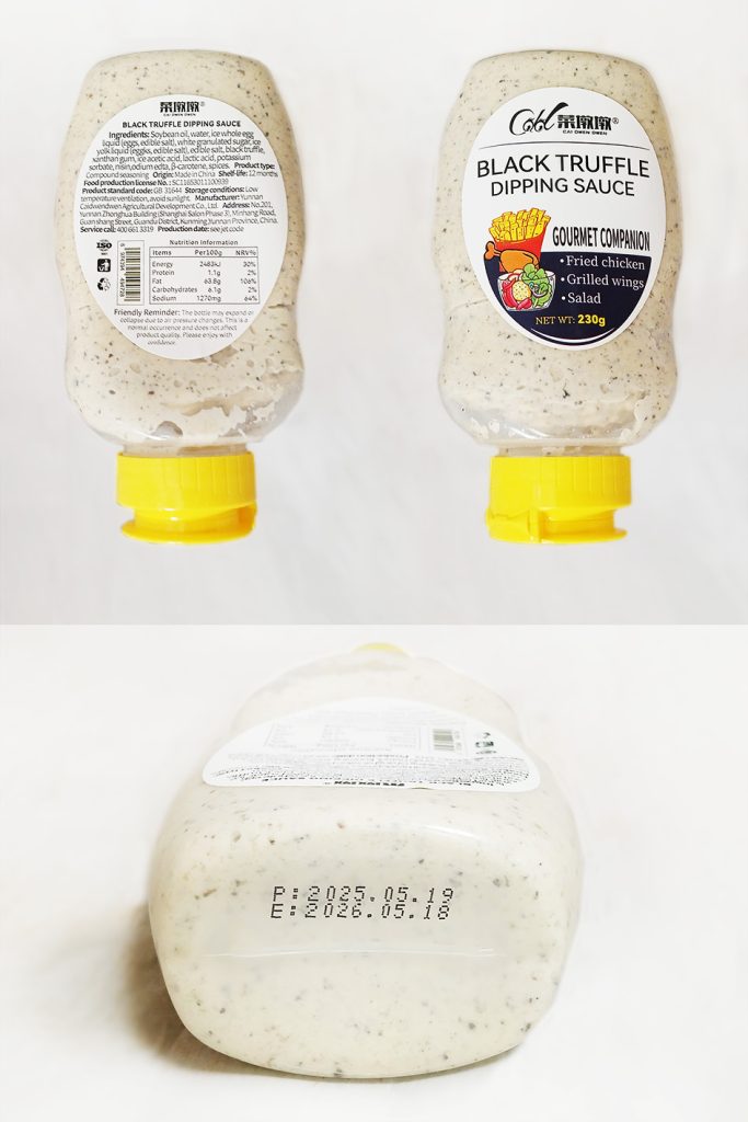 涉事預包裝蘸醬汁品牌為“菜墩墩”,產品名稱為“BLACK TRUFFLE DIPPING SAUCE”,淨重二百三十克,批次為P: 2025.05.19 E:2026.05.18,產地為中國,該產品樣本被檢出山梨酸含量為每公斤一千二百毫克。