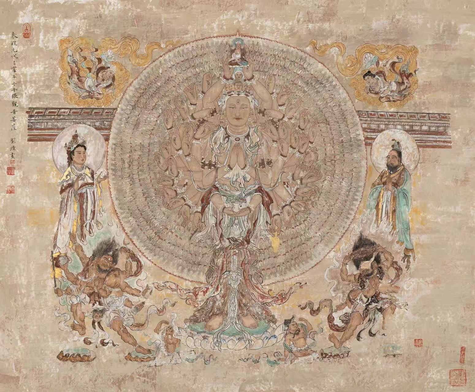 劉璟生於敦煌,長於敦煌,自幼受莫高窟壁畫薰陶,後進入故宮博物院從事研究工作。這種“敦煌底色”與“故宮視野”的結合,使其作品兼具故園情感的溫度與學術研究的深度。她以博士論文《敦煌飛天寫意性研究》為基礎,將敦煌飛天、菩薩等經典形象通過岩彩、油畫、數字版畫等媒介重新詮釋,既保留壁畫古樸神韻,又融入現代構成主義與數字技術。