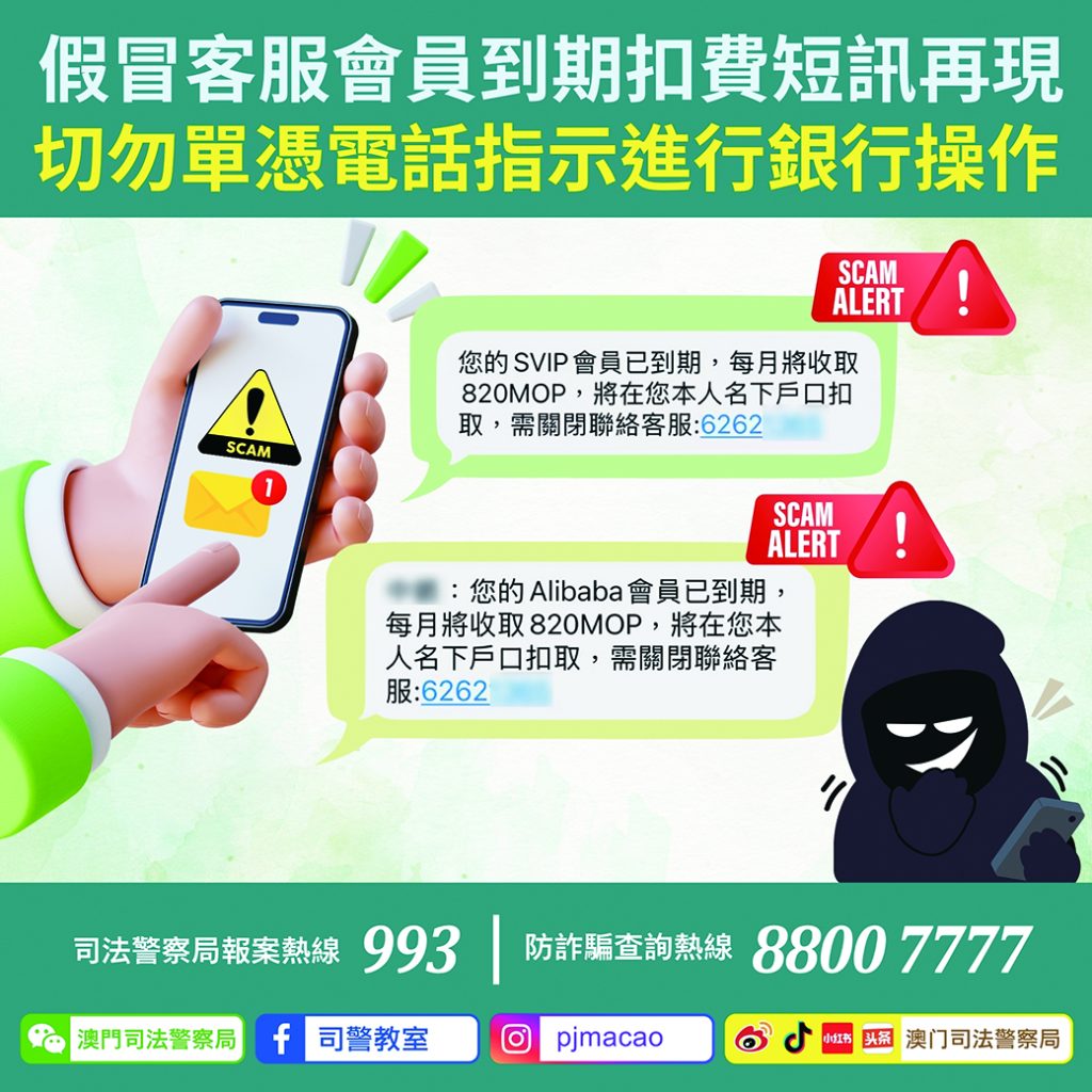 司警稱,上述詐騙手法與去年在本澳首現並高發的假冒平台客服電話詐騙相同,倘市民誤信短訊內容主動聯繫假客服,騙徒將會以驗證身份、辦理退費等理由要求市民進行視頻通話、分享屏幕、提供個人及銀行帳戶資料、甚至轉帳至指定帳戶等操作,藉此詐騙市民金錢。