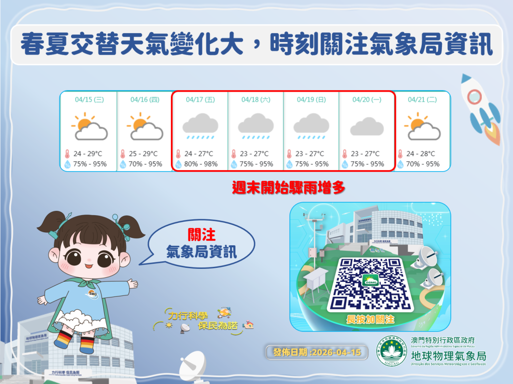 為進一步優化巿民獲取天氣資訊的體驗,提供更快捷的預警提示,以及更生活化的氣象服務,氣象局近期推出了全新 “澳門天氣”App (體驗版),歡迎巿民下載體驗,並留意相關活動的消息。