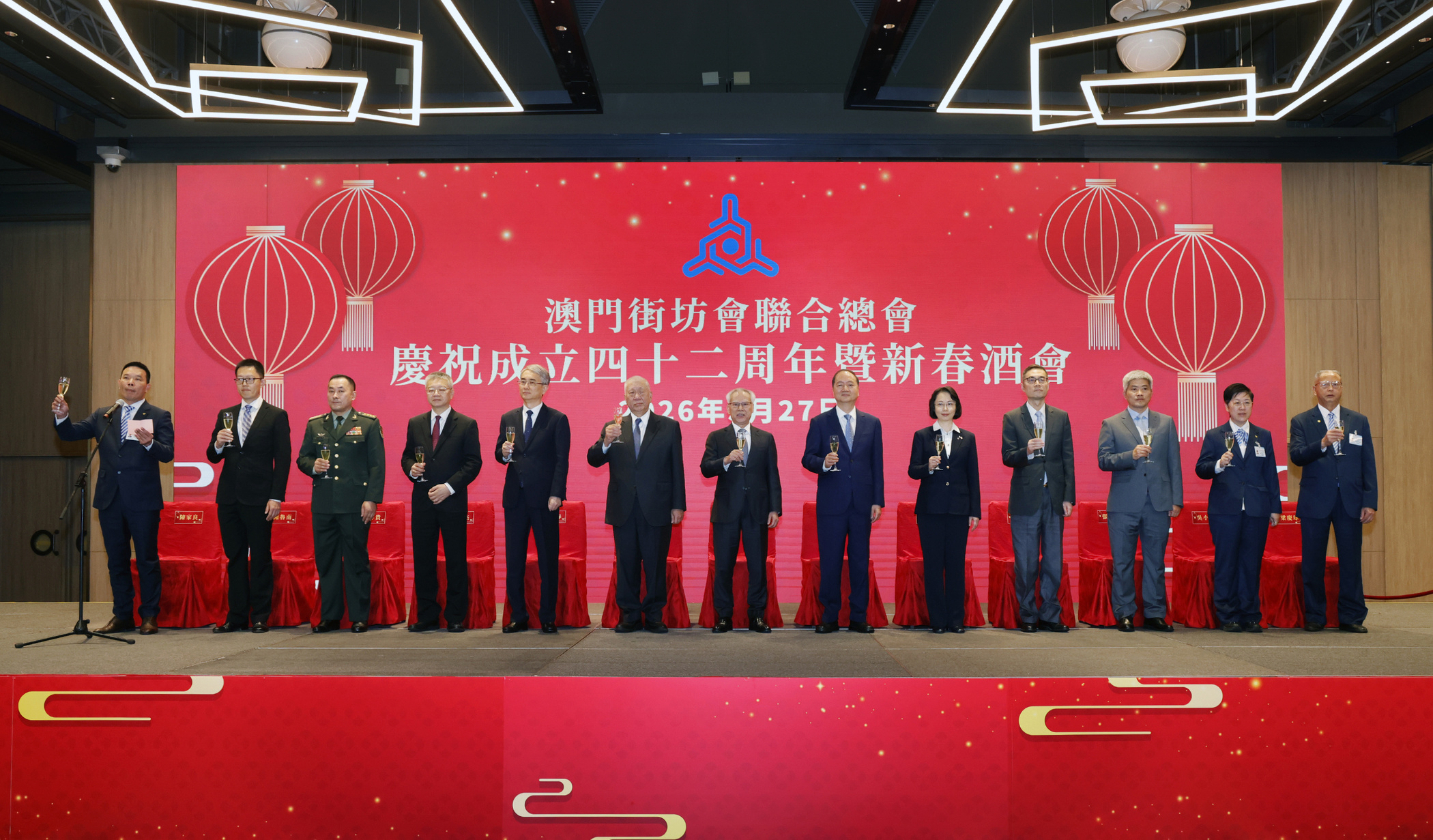 行政長官岑浩輝、全國政協副主席何厚鏵、澳門中聯辦主任鄭新聰、社會文化司司長柯嵐等出席街總新春酒會。