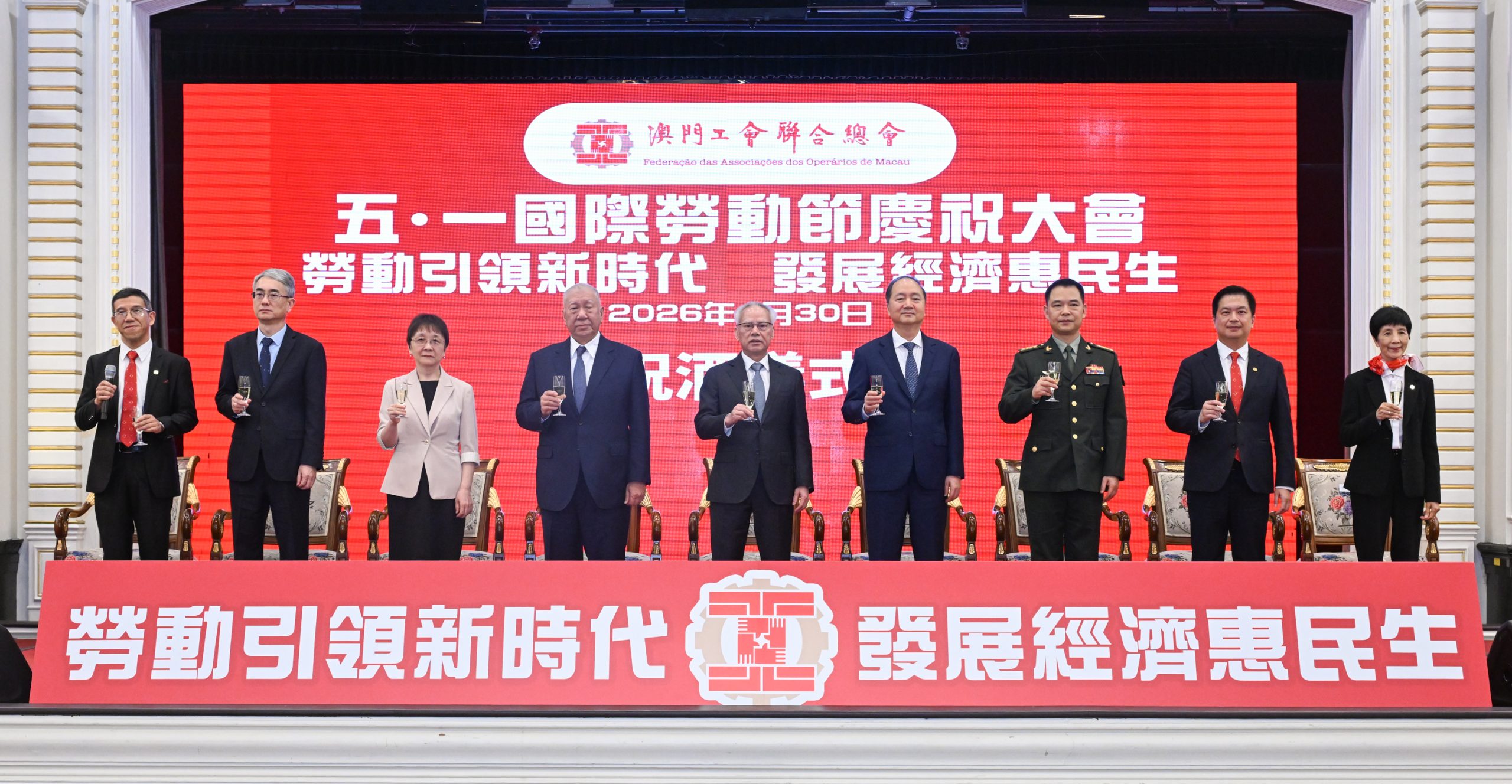 工聯昨日舉行慶祝 “五一”國際勞動節大會,行政長官岑浩輝、全國政協副主席何厚鏵、澳門中聯辦主任鄭新聰、外交部駐澳特派員公署特派員卞立新等人出席。