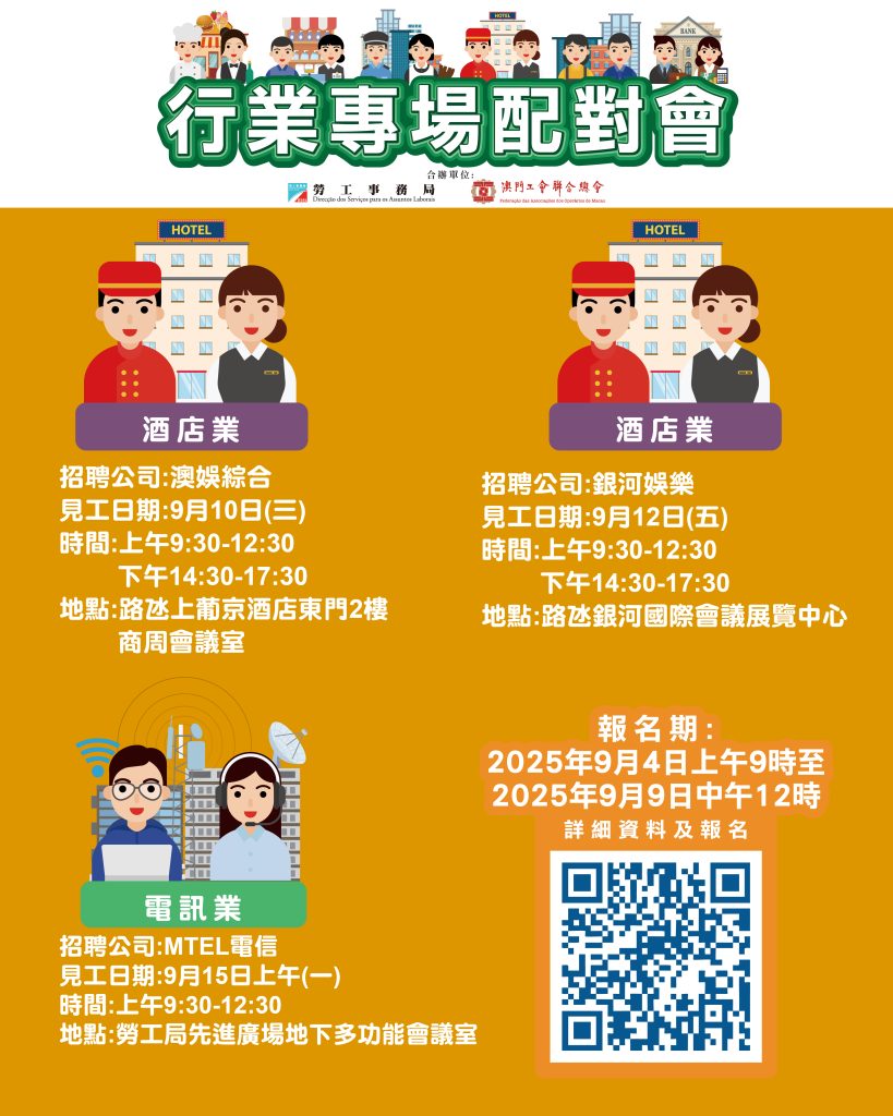 九月十日全日舉辦「澳娛綜合度假股份有限公司」專場配對會,提供十二個職位空缺,涉及前台主任、禮賓主任、管家部主任、娛樂視聽主任及娛樂視聽技術員等。配對會在澳門上葡京酒店二樓商周會議室舉行。