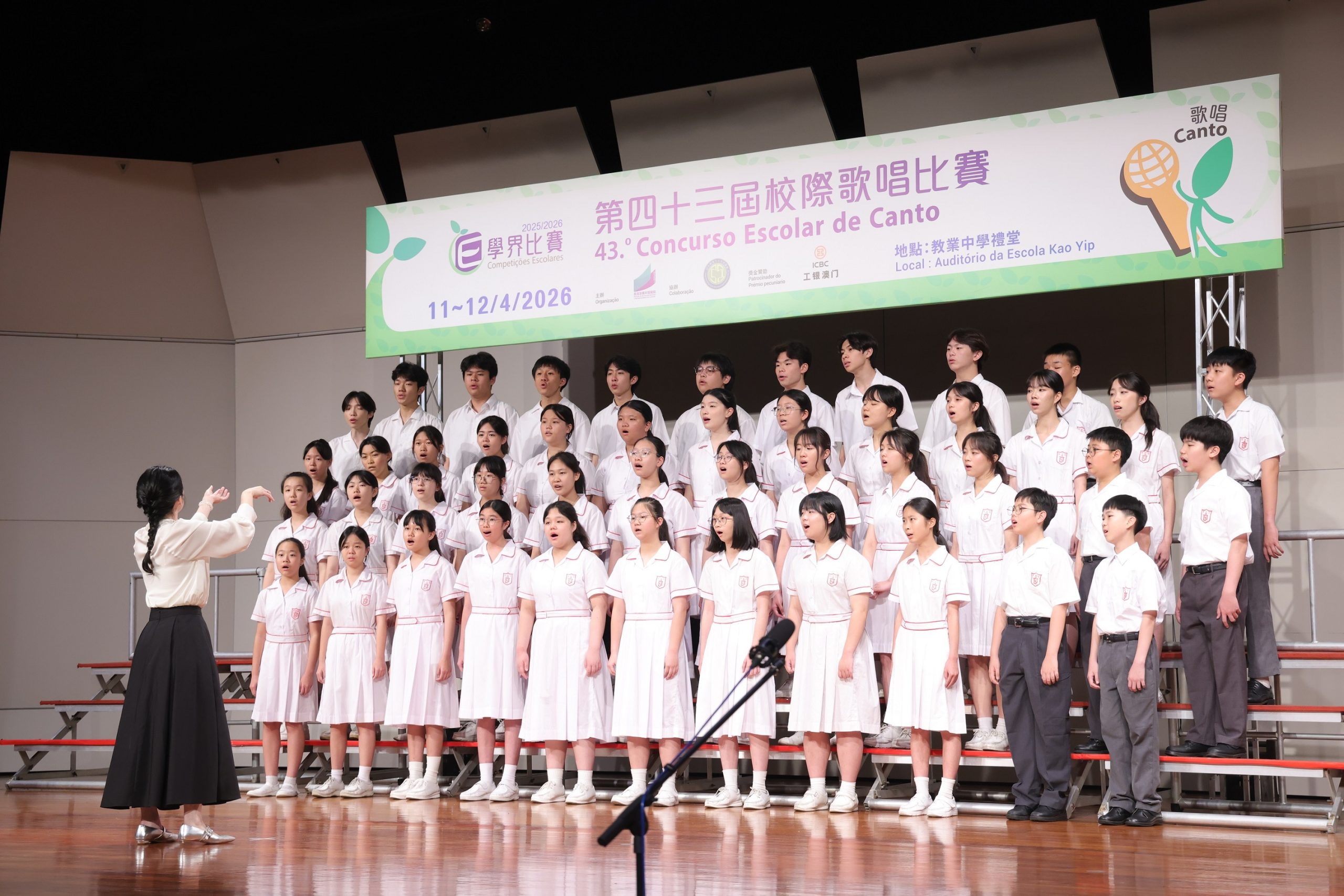 【本報訊】為促進學生的多元發展,發揮學生的潛能以及提升不同領域的藝術水平,並加強各學校間的音樂文化交流,由教育及青年發展局主辦、亞太教育文化交流協會協辦、中國工商銀行(澳門)股份有限公司獎金贊助的2025/2026學年第四十三屆校際歌唱比賽已於2026年4月11日及12日假教業中學禮堂圓滿完成。