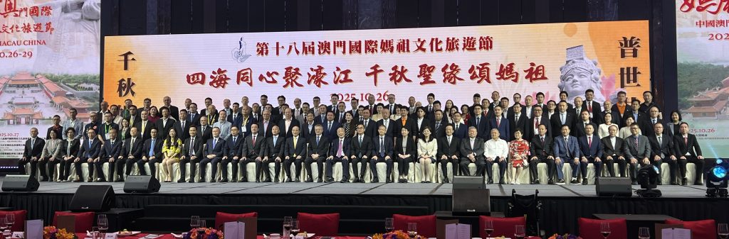 【本報訊】由澳門中華媽祖基金會主辦,湄洲媽祖祖廟董事會協辦,澳門基金會贊助的「第十八屆澳門國際媽祖文化旅遊節開幕式暨乙巳年媽祖祭典」將於今日上午十時在澳門媽祖文化村舉行,活動組委會昨晚舉行歡迎宴會,與來自內地、台灣及「一帶一路」沿線國家宮廟代表等海內外嘉賓逾千人歡聚一堂,以媽祖之恩澤,連結兩岸同胞的情感,促進心靈的契合,共同構建中華民族偉大的精神家園。