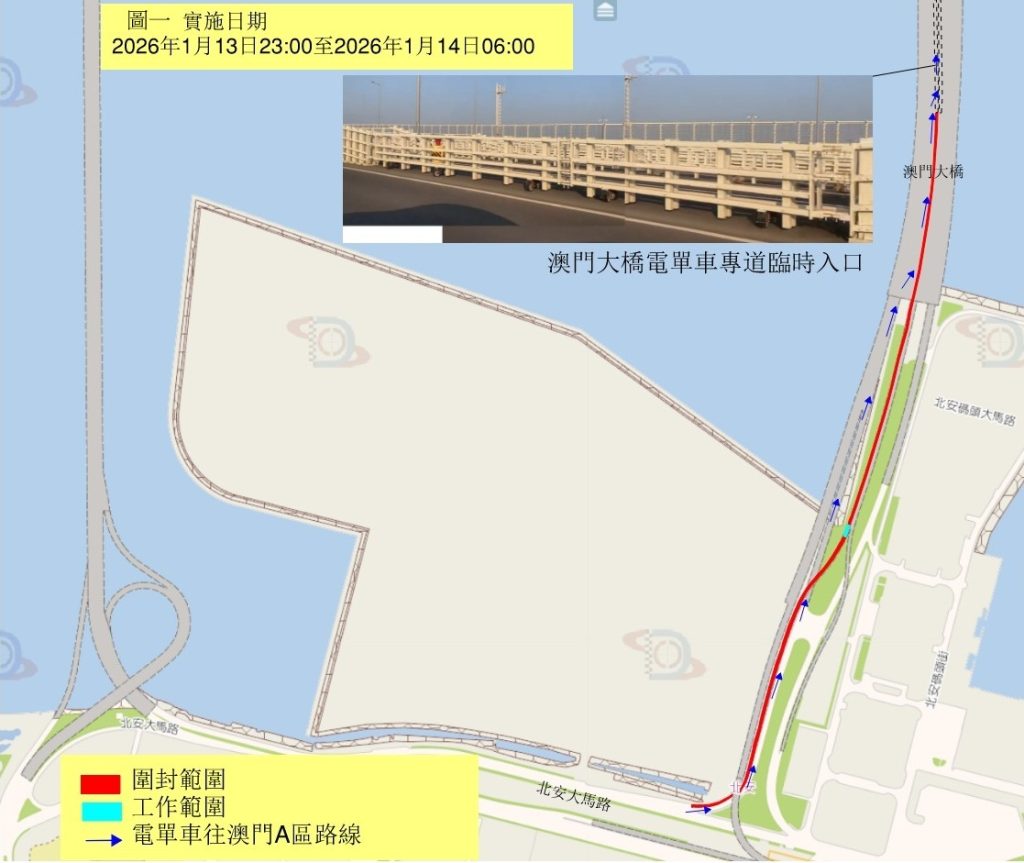 - 2026年1月13日晚上11時至翌日上午6時,氹仔北安往澳門A區的電單車引橋將臨時封閉,電單車駕駛者可經北安大馬路使用澳門大橋汽車車道上橋後,再駛入電單車專道前往澳門A區。(詳見圖1)