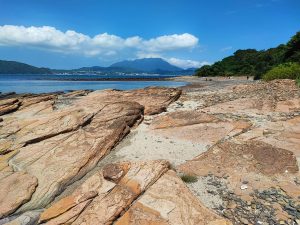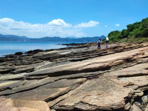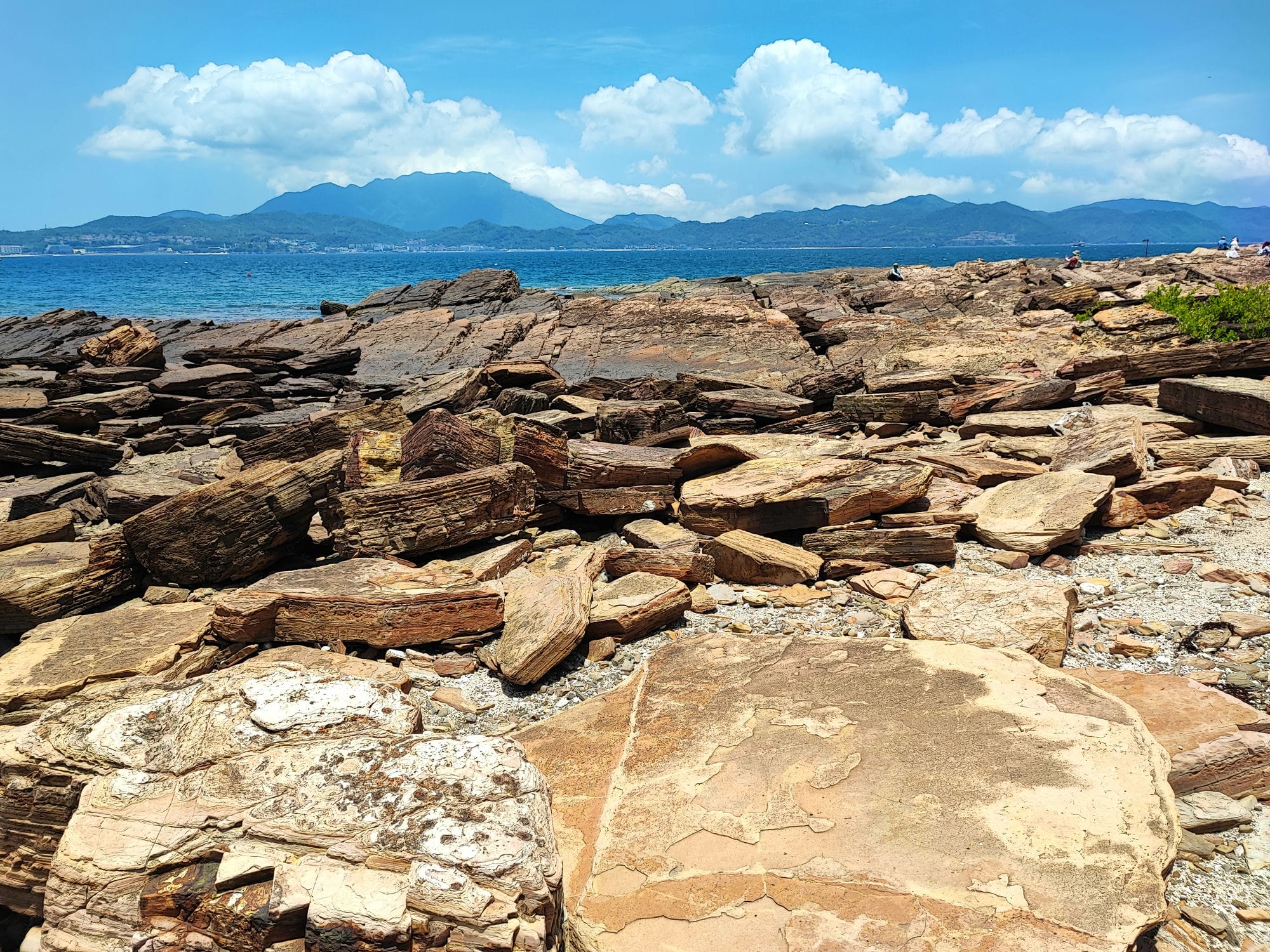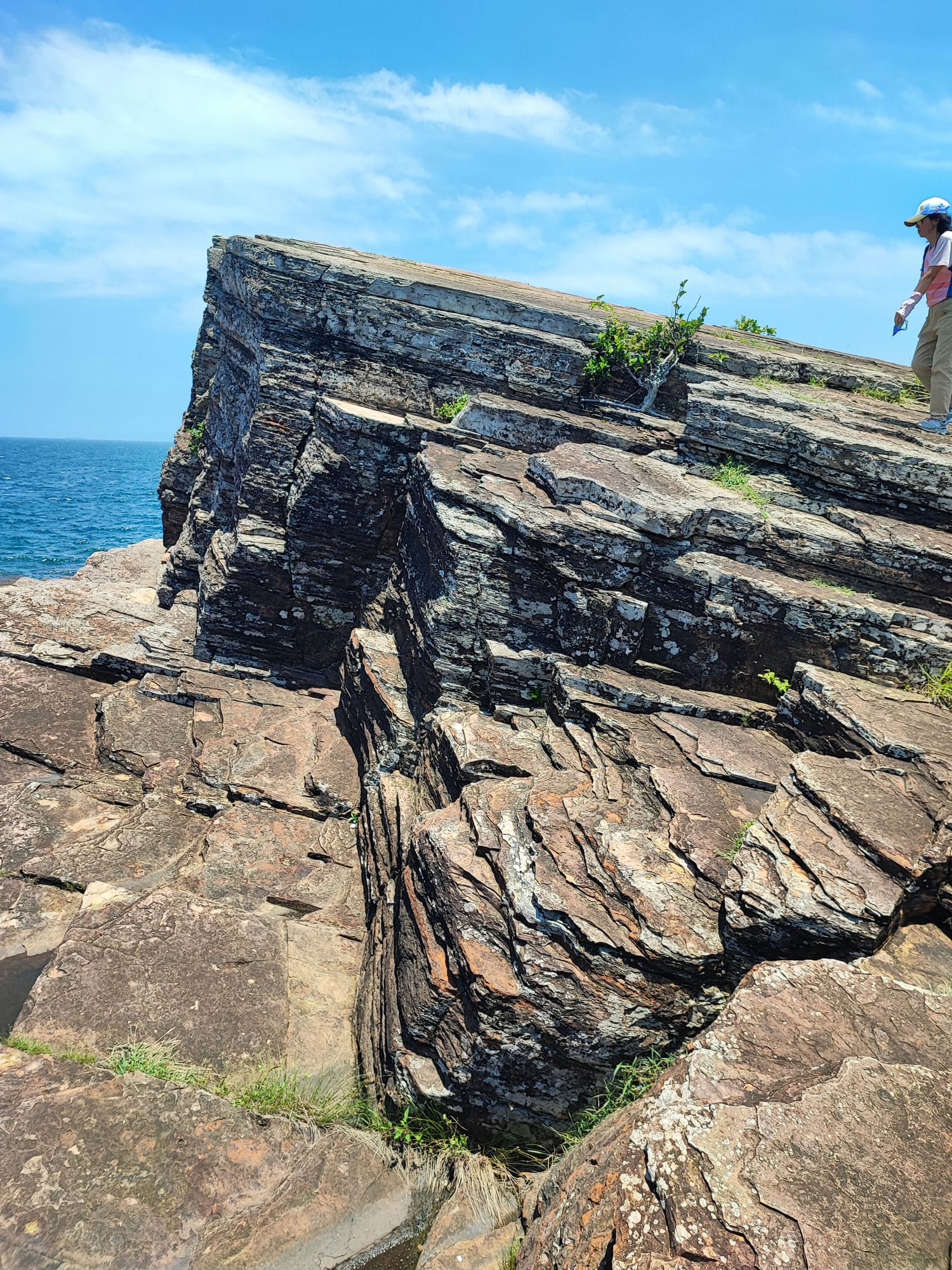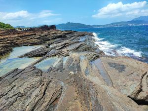 不同粗幼的粉砂岩,彼此層層相疊,向著蔚藍的大海伸延。頁岩色彩豐富,有裴紅、灰炭、墨綠、青紫等五彩顏色。形狀獨特,多角方塊,橢圓的奇趣形狀。