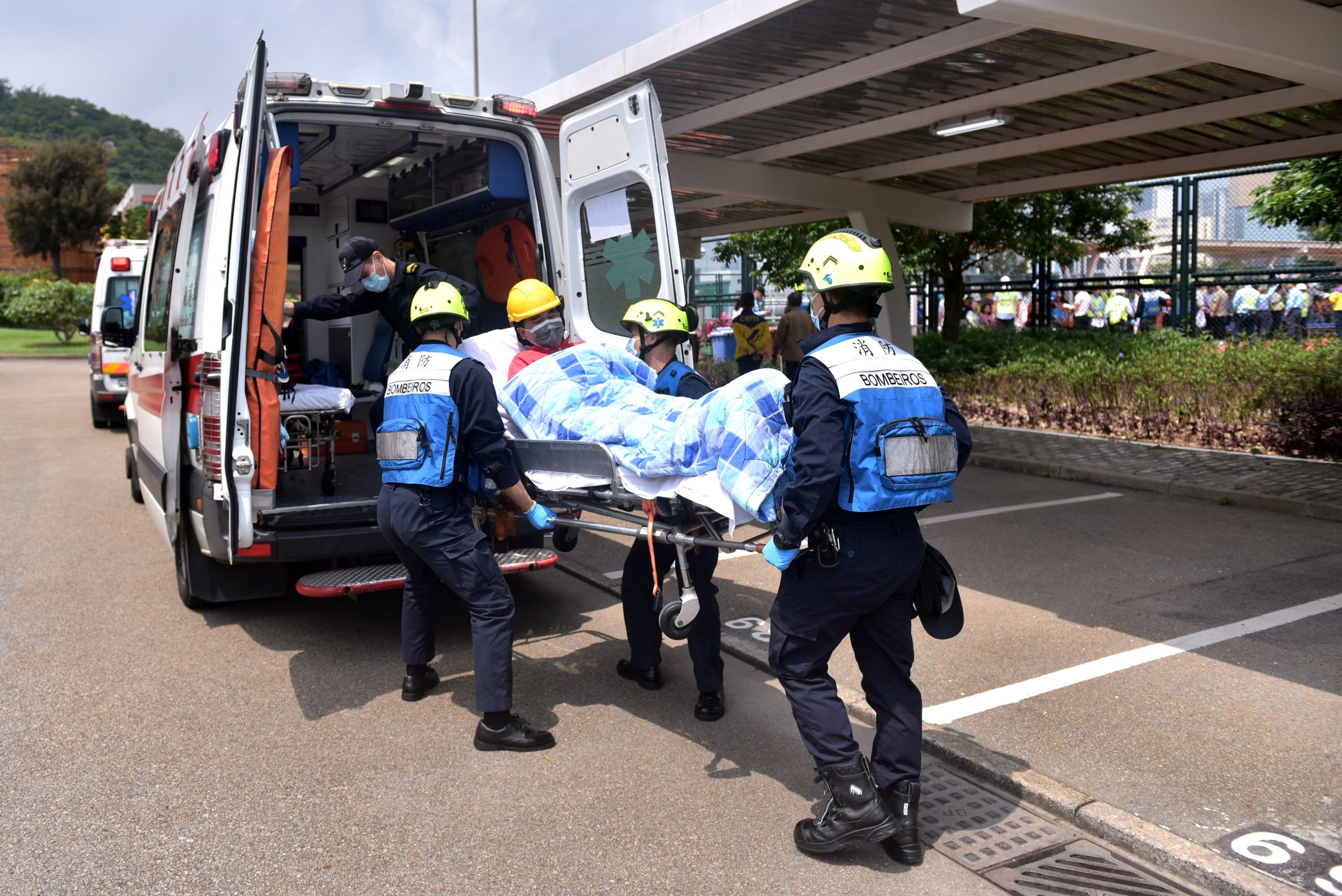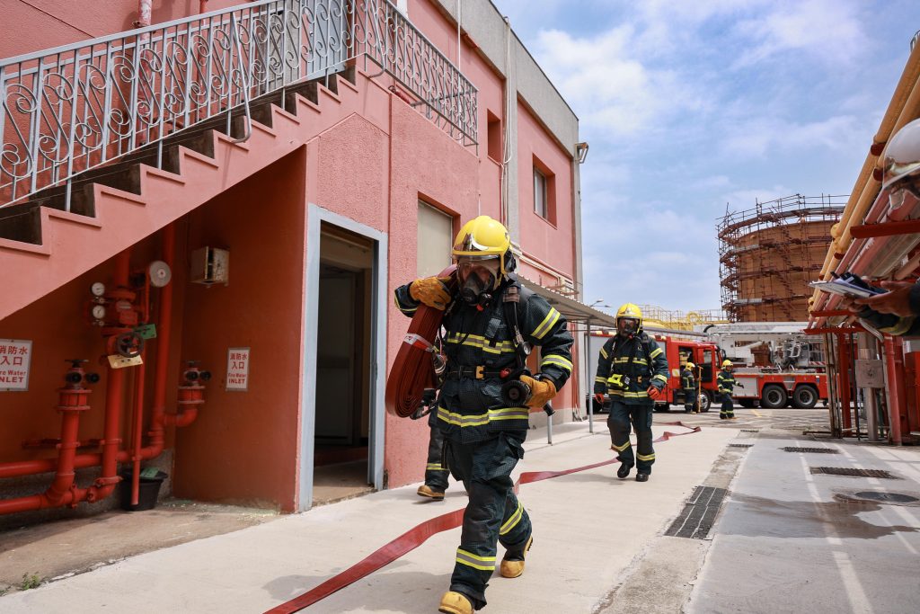 消防局接報後,隨即派遣六輛緊急車輛及二十八名人員趕赴現場,按照既定行動預案展開滅火救援及疏散工作。同時,救護員在疏散集合點清點人數,並對一名疏散期間受傷的員工進行護理後模擬送院。