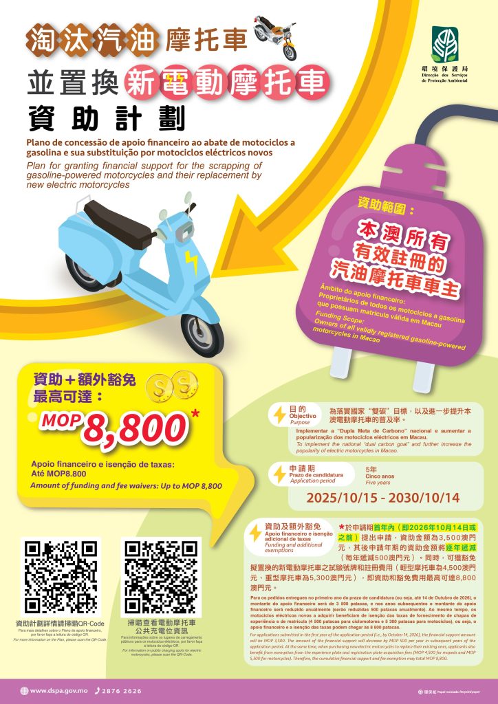 環保局稱,資助計劃是配合國家實現“雙碳”目標的重要舉措,亦是特區政府本年度施政方針和“澳門電動車推廣計劃”的重點工作,申請期由今年十月十五日至二零三零年十月十四日,為期五年。資助對象範圍擴大至所有在澳門特別行政區具備有效註冊的重型或輕型汽油電單車車主,但不包括在今年十月六日或之後已被取消註冊且其後重新註冊的電單車車主,以及結欠澳門特別行政區債務的電單車車主。