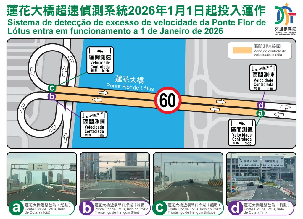 【本報訊】為保障道路使用者的安全,經交通高等委員會審議通過,及經交通事務局與治安警察局協調,蓮花大橋新增定點超速偵測系統及區間超速偵測系統,將於下月一日凌晨零時起投入運作,以打擊超速違規行為。