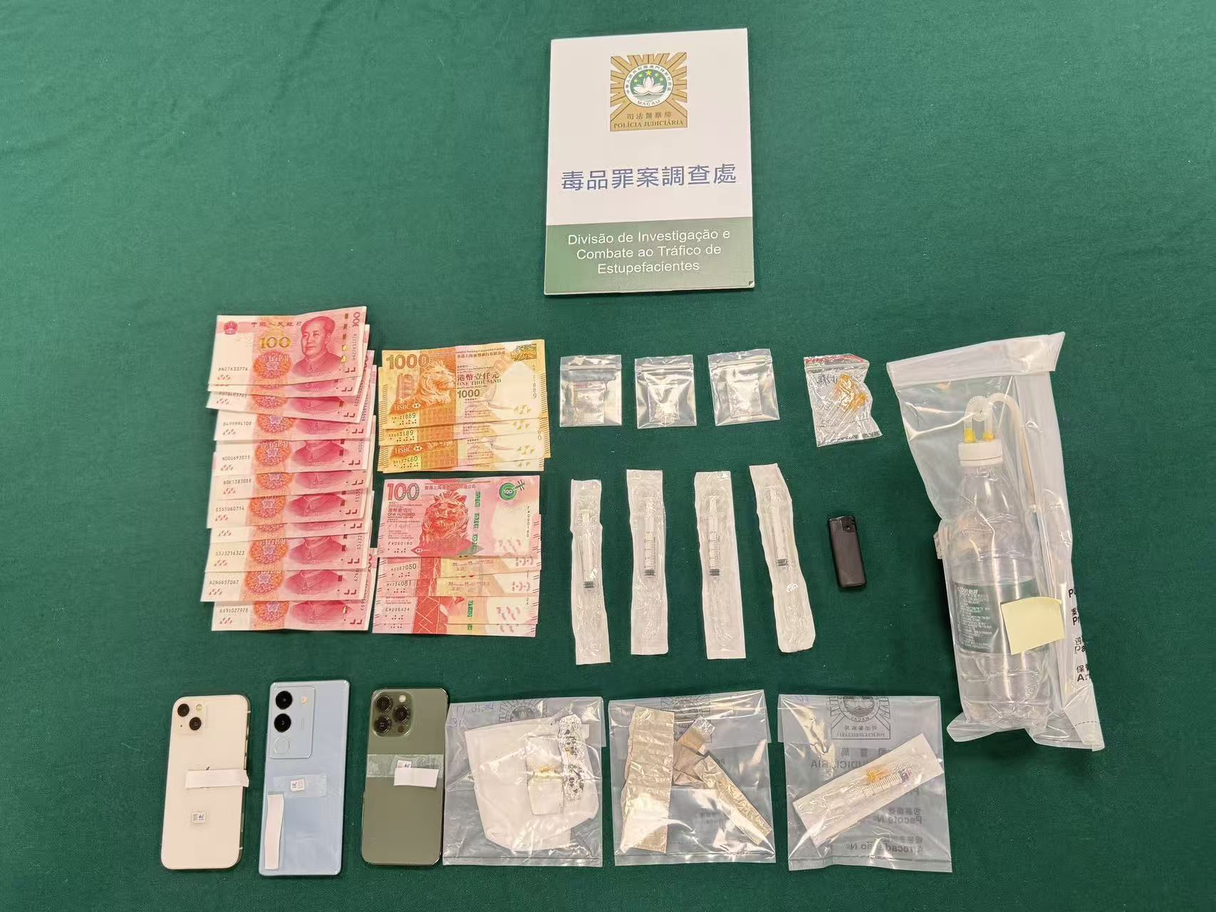案情指,前日早上,司警接獲路氹某酒店職員報案,指早前清潔工人打掃某房間發現懷疑有毒品及吸毒工具。警員到場在保安協助下,於酒店範圍內拘捕涉案的施某及兩名陳某,帶返該房調查。當時該房還未退房,司警在餐枱上起出一點四二克海洛英、零點四一克冰毒以及吸毒工具,毒品市值三千二百澳門元。司警查悉,疑犯有吸毒的習慣,早前施某從內地偷運毒品來澳後,與兩名陳某一同“開餐”。三人經驗尿證實對毒品呈陽性反應。警方正追查毒品的來源。