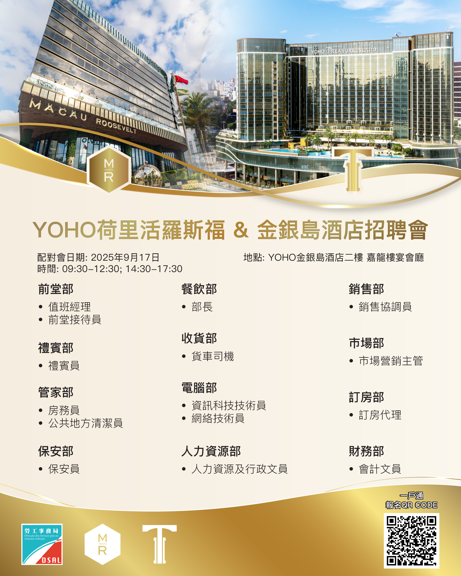 專場配對會於九月十七日全日舉行,提供六十三個職位空缺,涉及前堂部值班經理、市場營銷主管、餐飲服務主管、人力資源及行政文員、資訊科技技術員、前台接待員、公共地方清潔員及房務員等。配對會於澳門金銀島酒店二樓嘉龍樓宴會廳舉行,報名日期為九月十一日上午九時至九月十六日中午十二時。
