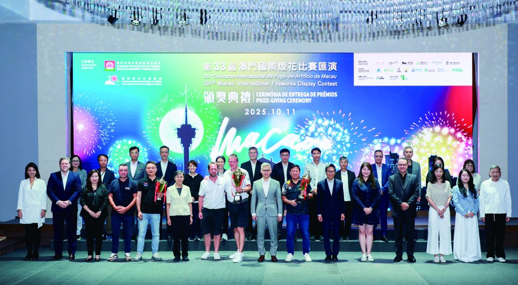 【本報訊】旅遊局主辦的第33屆澳門國際煙花比賽匯演圓滿落幕並舉行頒獎典禮。來自世界各地的10間煙花公司施展渾身解數,在橫跨9月和10月的5個煙花夜爭妍綻放。經過一輪角逐,最終由來自英國的Pyrotex Fireworx煙花公司奪得冠軍寶座,來自菲律賓的Platinum Fireworks煙花公司及中國的東信煙花公司分別奪得亞軍及季軍。