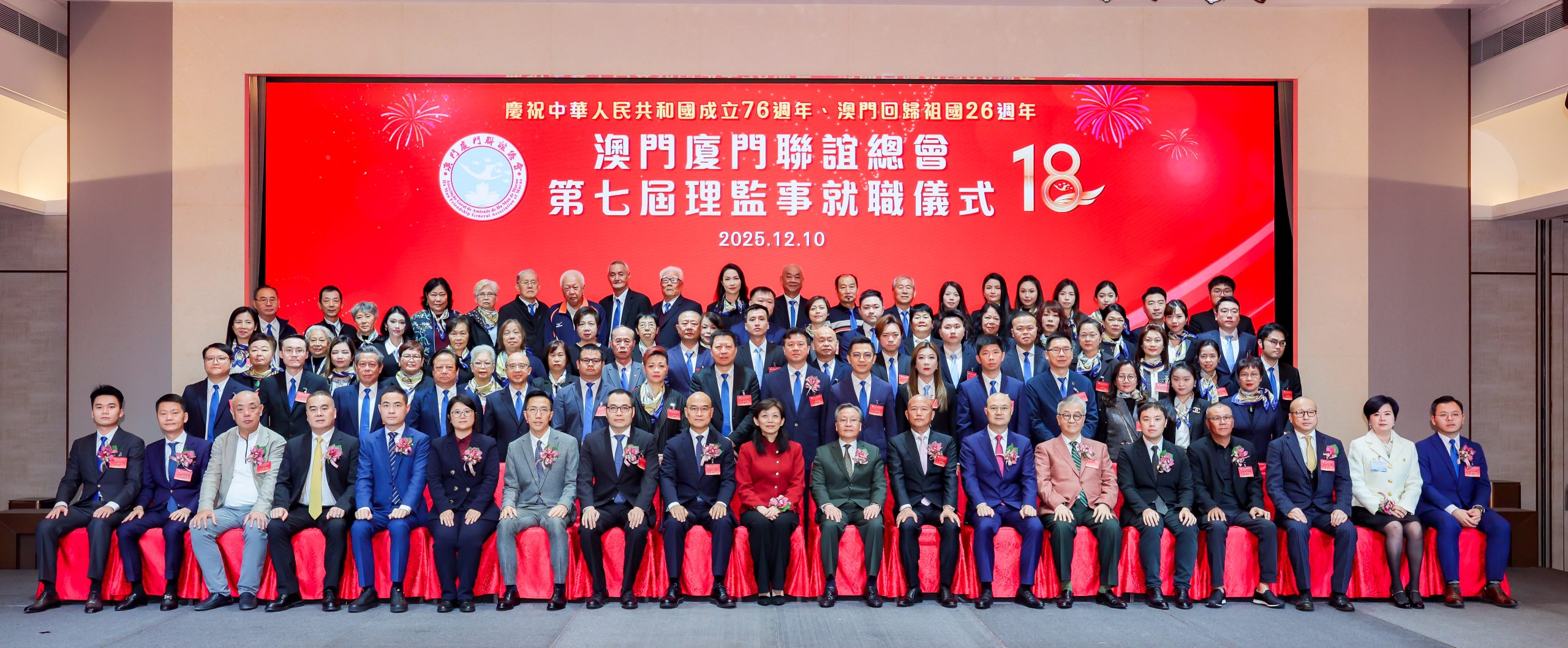 【本報訊】澳門廈門聯誼總會昨晚在旅遊塔會展娛樂中心三樓宴會廳舉行慶祝澳門回歸祖國二十六周年,該會成立十八周年暨第七屆理監事就職及澳門廈門青年聯誼會成立暨首屆理監事就職典禮。中聯辦協調部部長仇昱,廈門市政協副主席林重陽,澳區全國人大常委高開賢,福建省海外聯誼中心主任陳燕影,全國政協委員、澳門福建同鄉總會會長陳明金,澳門經濟及科技發展局局長邱潤華,澳門特區檢察院助理檢察長程立福,全國人大代表、立法議員施家倫,澳門行政會委員、立法議員宋碧琪,澳門廈門聯誼總會創會會長吳在權,立法議員李良汪、陳禮祺,澳門廈門聯誼總會永遠會長陳明旭、呂聯發、曾志龍、蘇建華等嘉賓出席主禮。
