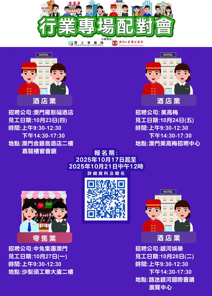 十月二十七日上午舉辦「中免集團澳門一人有限公司」專場配對會,合共提供三十個職位空缺,涉及銷售員。配對會在工聯總會二樓舉行。