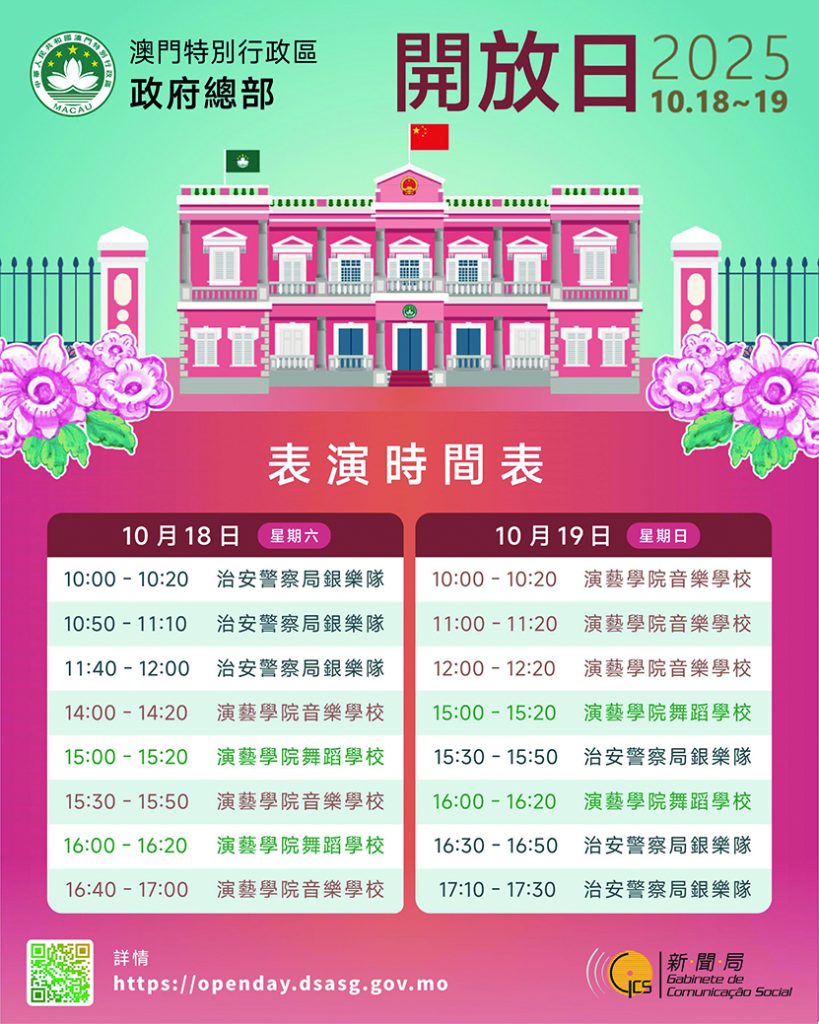 表演節目方面,治安警察局銀樂隊、演藝學院音樂學校和舞蹈學校學生將於兩天開放日的指定時段,為公眾呈獻樂器演奏及舞蹈表演。郵電局繼續在政府總部對面的南灣湖畔設置臨時櫃枱,提供加蓋紀念郵戳的服務,並發售相關郵品。公眾參觀政府總部可獲贈紀念品,送完即止。