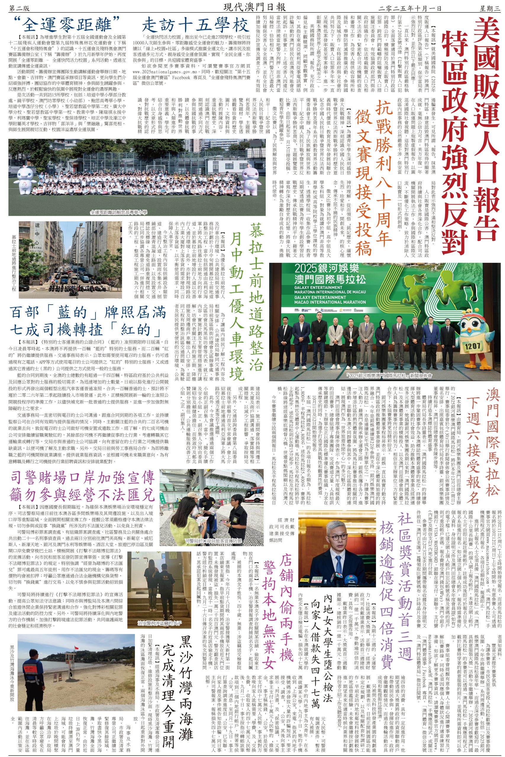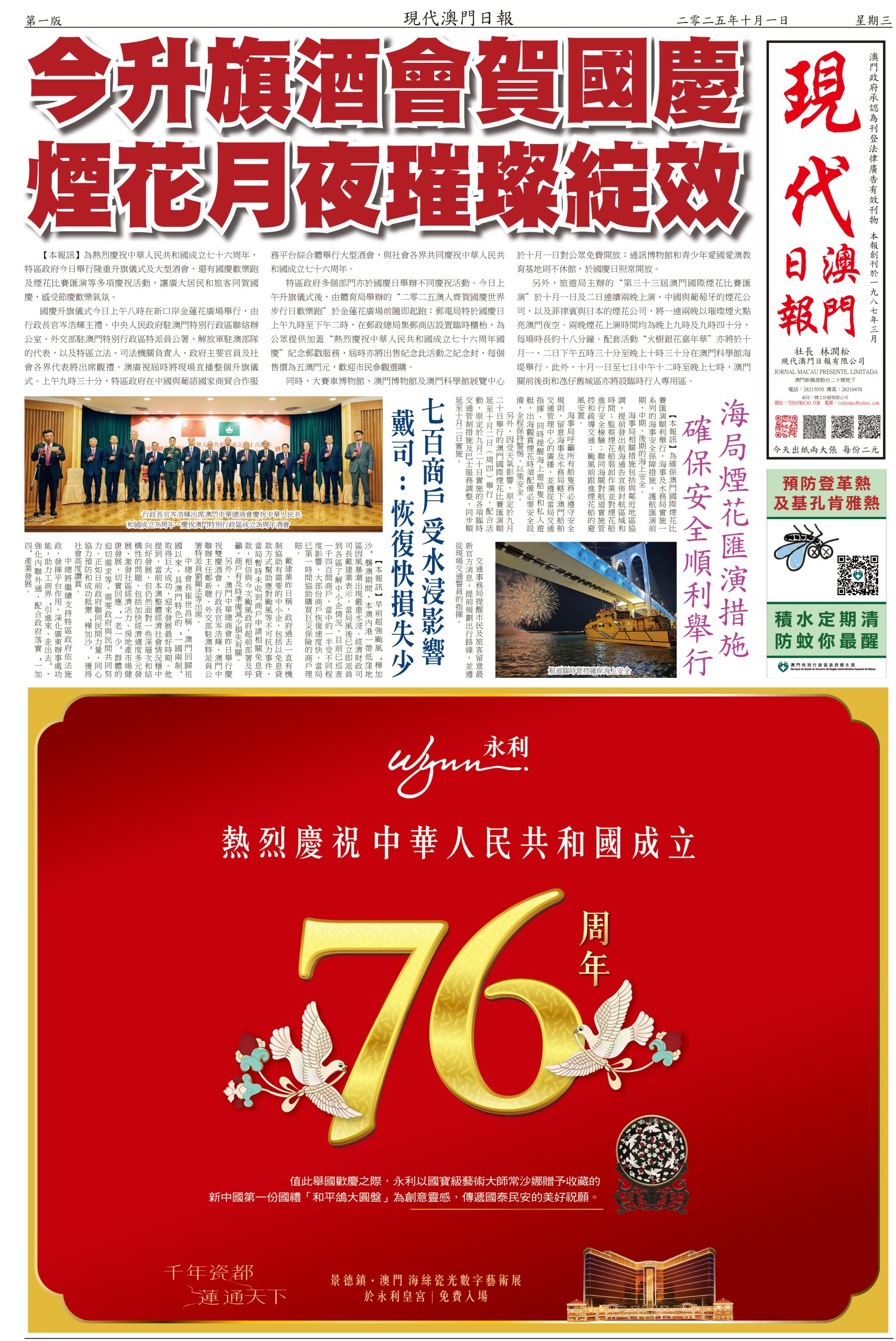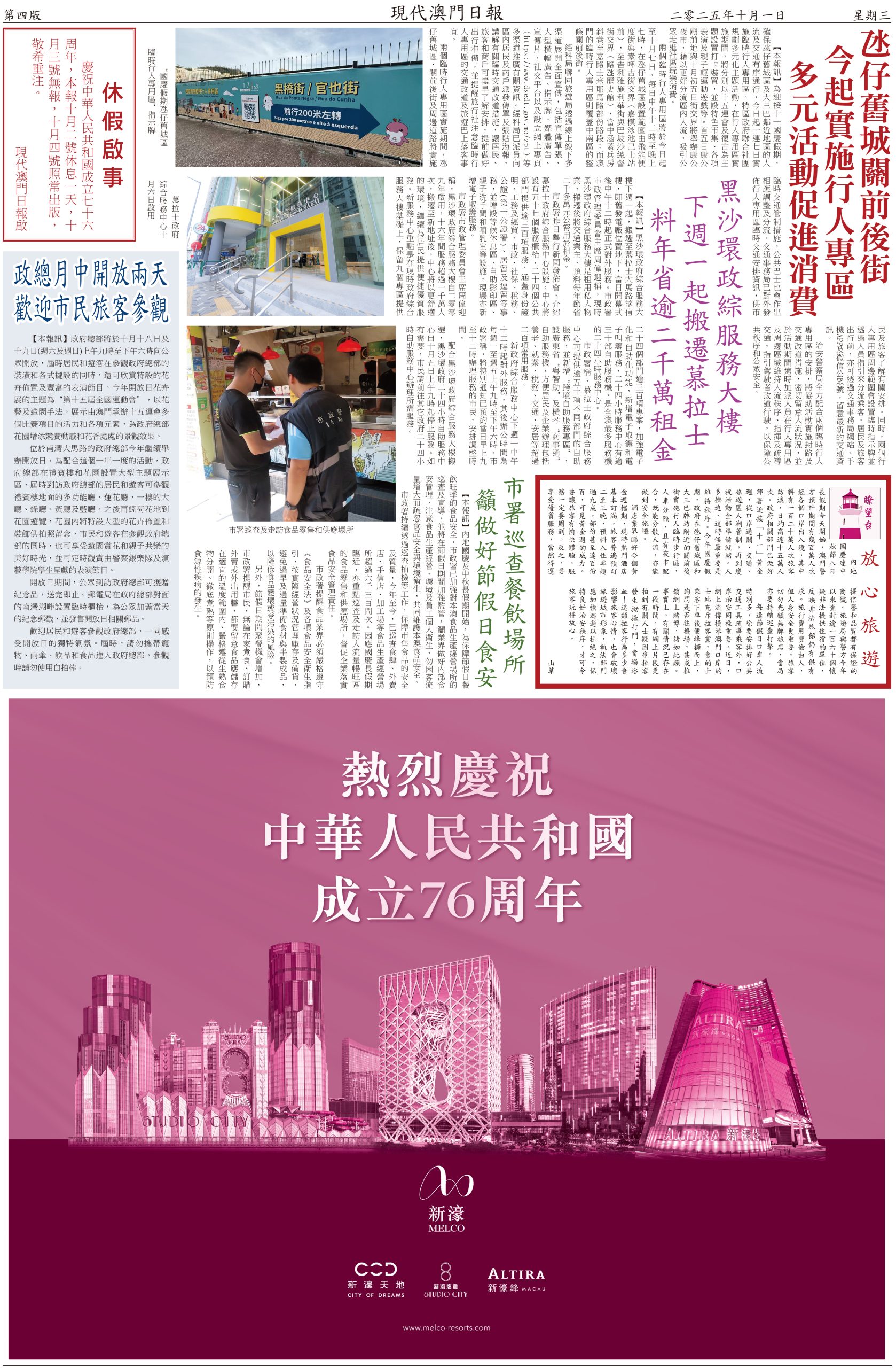 內地國慶連中秋節八日長假期今天開始,澳門警方預計期間有幾百萬人次經各個口岸出入境,其中料有一百二十萬人次旅客訪澳,日均高達十五萬人次。政府相關部門已做好部署迎接「十一」黃金週,從口岸通關、交通、旅遊區人潮管制,再到慶祝活動全部準備就緒。人多擠迫,這時候最重要是維持秩序。今年國慶假期,政府在氹仔舊城區和大三巴牌坊附近的關前後街實施行人臨時步行區,人車分隔,且有夜市配合,既能分散人流,亦能做到安全旅遊。