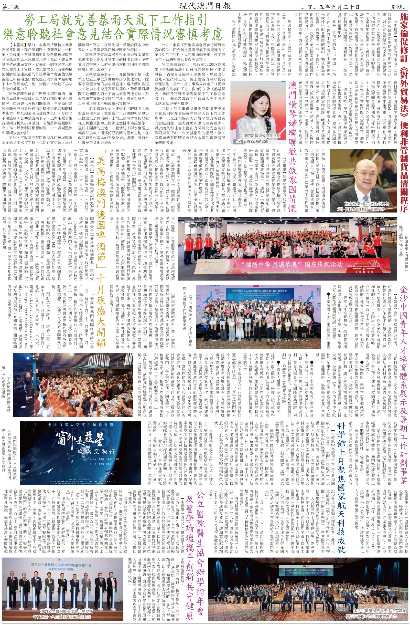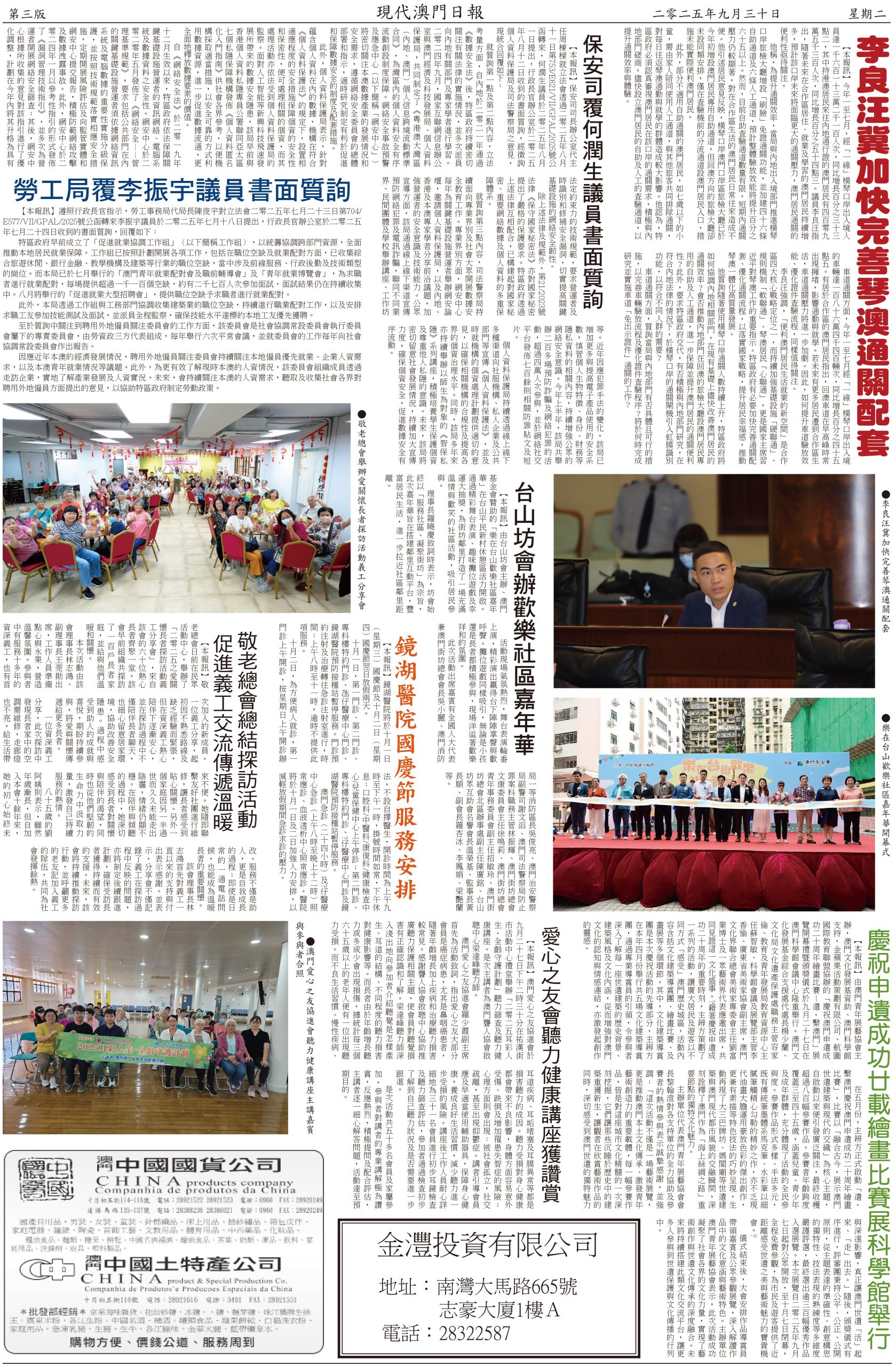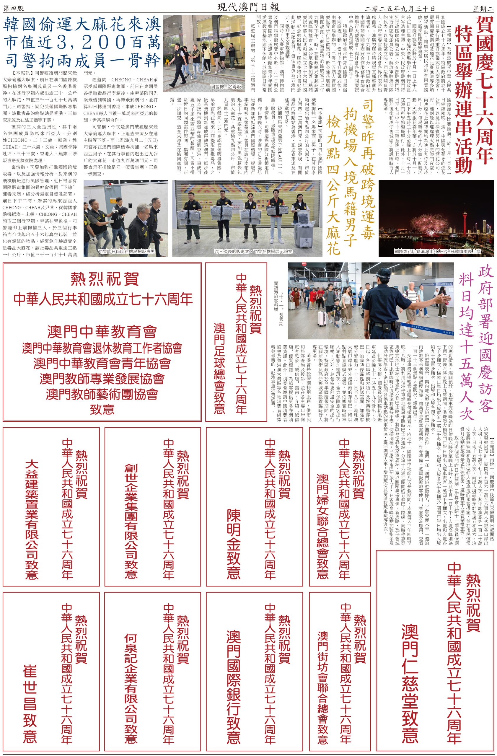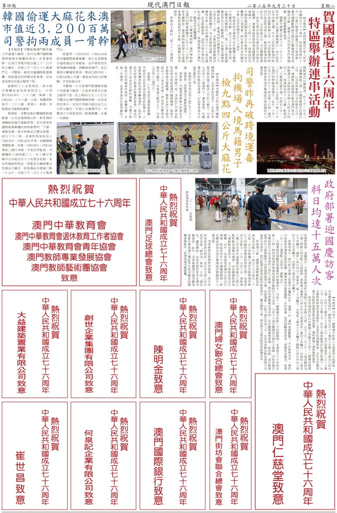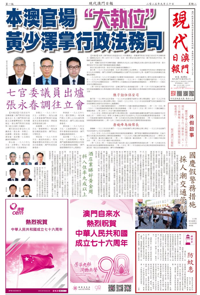 【本報訊】隨著國慶與中秋雙節臨近,預計訪澳旅客數量將顯著攀升。為保障假期期間社會秩序穩定、口岸通關高效及市民旅客出行安全,治安警察局提前制訂國慶及中秋假期的工作預案,以及各口岸和旅遊景點周邊的臨時交通措施,全力營造平安、有序、便捷的節日環境。